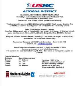 ADUSBC Graduating Youth Bowlers!!! Apply for the ADUSBC 2026 Senior Scholarshipon or before April 4th 2026USBC Youth ScholarshipsOne of the great benefits of USBC Youth membership is the chance to earn college scholarships so you can pursue your dreams. More than $6 million in annual scholarships are awarded to youth bowlers each season based on academic, leadership and on-lane performances. There are several national scholarships with links to the application portal. |